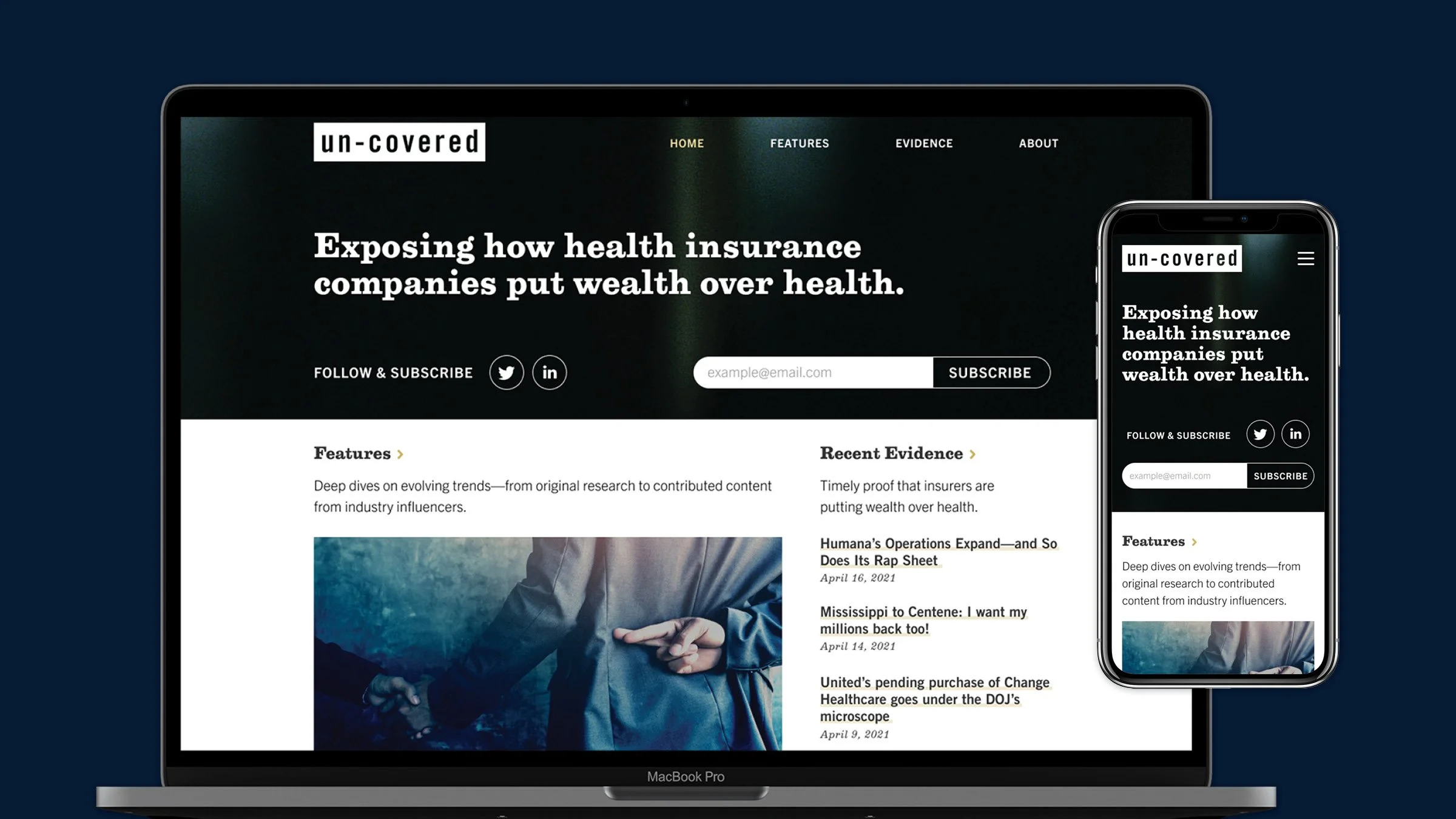 Through its work with providers organizations around the country, this practice gained invaluable insight into payer trends that were negatively impacting clients. The impetus for Un-covered was to centralize this knowledge and gather proof points from relevant media coverage. I worked hand-in-hand with a UX designer to develop what is essentially a news aggregator with a specific managed care POV layered on top. I ran a team that monitored payer news and selected three pieces of coverage to highlight each week. I mentored junior employees as they worked on writeups and also partnered closely with a colleague in the managed care practice to build out supporting extensions such as a newsletter and social media page.